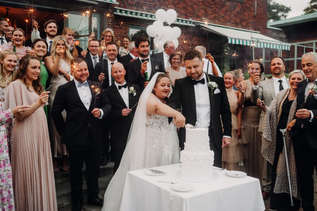 Dere trenger ikke inkludere hele selskapet. En gruppe på 15–20 personer er ofte mer enn nok, og gjør gjennomføringen enklere. Sent på kvelden er ofte mange av gjestene mer enn fornøyde med å kose seg innendørs med kaker og god drikke, så ta med dere vennegjengen ut for en morsom fotografering.